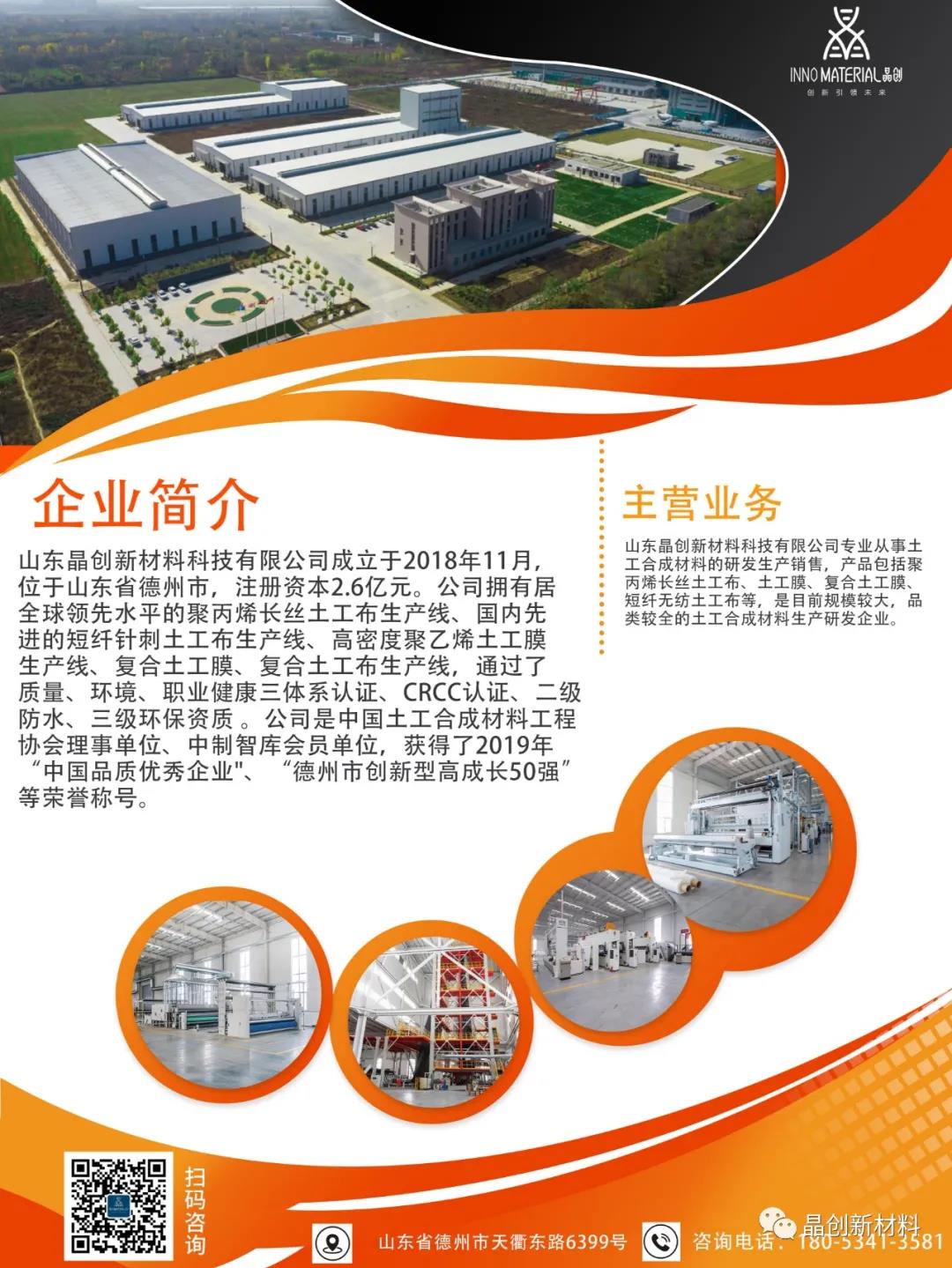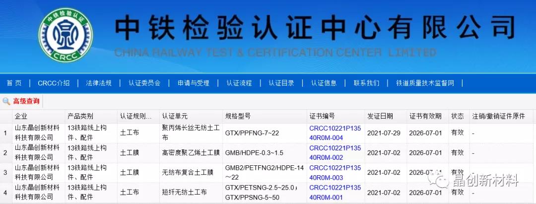 2021年7月14日、8月6日,在中國(guó)檢驗(yàn)認(rèn)證中心有限公司(CRCC)所發(fā)布的2021年(總第514號(hào))和第31號(hào)(總第518號(hào))認(rèn)證公告:山東晶創(chuàng)新材料科技有限公司所生產(chǎn)的土工膜和土工布連續(xù)獲得4份CRCC認(rèn)證證書(shū)。分別是土工膜類(lèi):高密度聚乙烯土工膜(證書(shū)編號(hào):CRCC10221P13540R0M-002),無(wú)紡布復(fù)合土工膜(證書(shū)編號(hào):CRCC10221P13540R0M-003);土工布類(lèi):短纖無(wú)紡?fù)凉げ迹ㄗC書(shū)編號(hào):CRCC10221P13540R0M-001),聚丙烯長(zhǎng)絲無(wú)紡?fù)凉げ迹ㄗC書(shū)編號(hào):CRCC10221P13540R0M-004)。