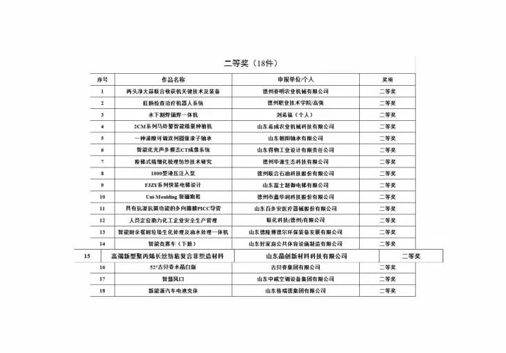 2021年11月24日,德州市人民政府公示了 德州市首屆“市長杯”工業(yè)設(shè)計大賽獲獎名單,山東晶創(chuàng)新材料科技有限公司榮獲二等獎,作品為“高端新型聚丙烯長絲紡粘復(fù)合非織造材料”。