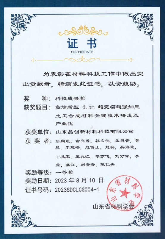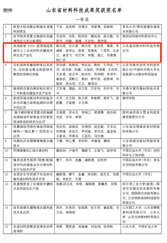 山東省材料學(xué)會(huì)成立專家委員會(huì),評(píng)出科技成果獎(jiǎng)一二三等獎(jiǎng)共 35 項(xiàng),山東晶創(chuàng)新材料科技有限公司申報(bào)此次評(píng)選,榮獲“山東省材料科技成果獎(jiǎng)-一等獎(jiǎng)”