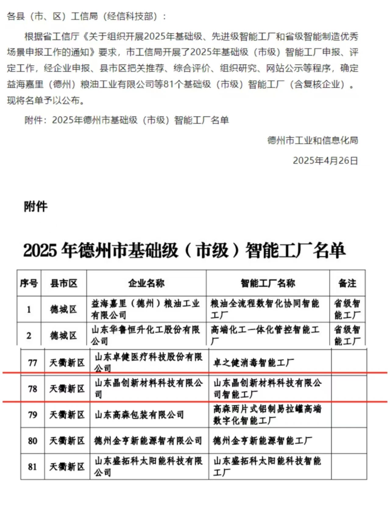 4 月 28 日,德州市工業(yè)和信息化局官網(wǎng)正式公布了德州市 2025 年基礎(chǔ)級(市級)智能工廠名單,山東晶創(chuàng)新材料科技有限公司(以下簡稱“晶創(chuàng)科技”)