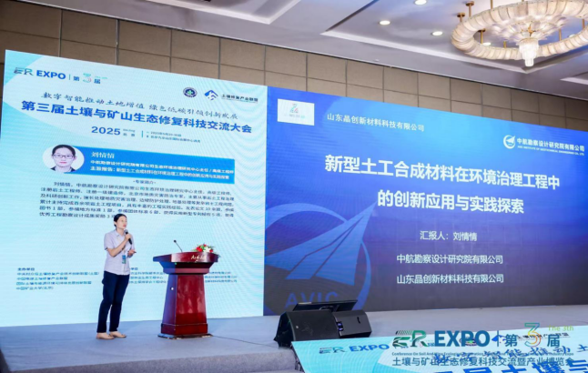 主論壇上,中航勘察設(shè)計(jì)研究院有限公司生態(tài)環(huán)境治理研究中心主任劉情情代表中航勘察設(shè)計(jì)研究院有限公司和山東晶創(chuàng)新材料科技有限公司做了題為《新型土工合成材料在環(huán)境治理中的創(chuàng)新應(yīng)用與實(shí)踐探索》的主旨報(bào)告;